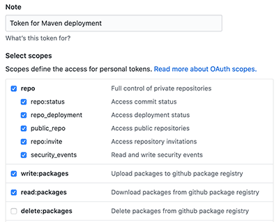 在发布前,我们必须首先登录后在用户的Settings-Developer settings-Personal access tokens中创建两个Token,一个用于发布,一个用于使用。发布Artifact的Token必须有repo、write:packages和read:packages权限: