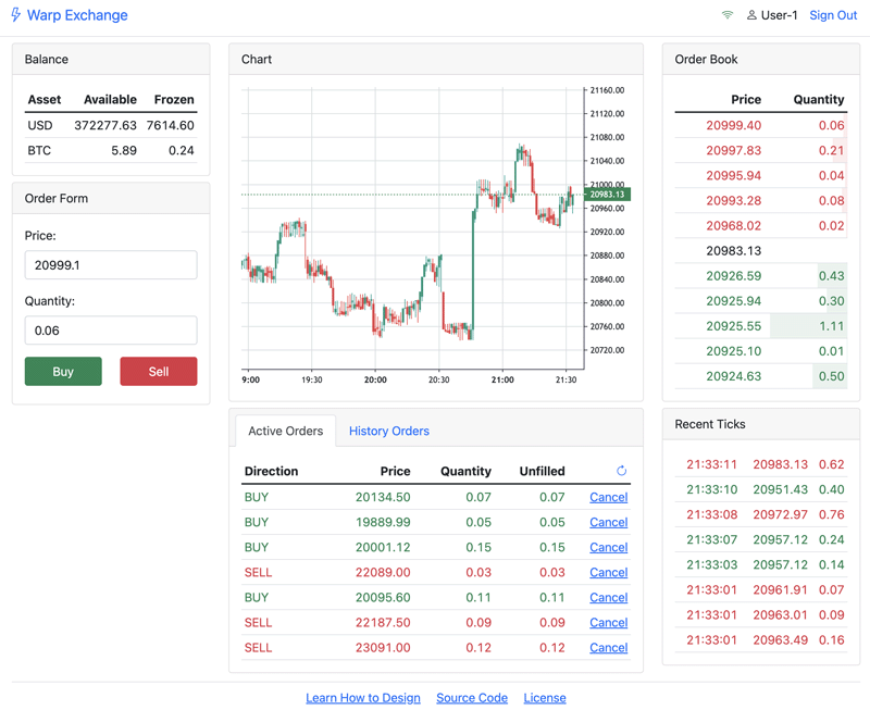 我们已经实现了API系统、交易系统、定序系统、行情系统和推送系统,最后就差一个UI系统,让用户可以登录并通过浏览器下订单。UI系统就是一个标准的Web系统,相对比较简单。