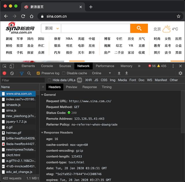 切换到Network,重新加载页面,可以看到浏览器发出的每一个请求和响应: