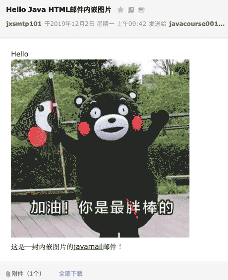 imagepart.setHeader("Content-ID", "<img01>");这个ID和HTML中引用的ID对应起来,邮件客户端就可以正常显示内嵌图片: